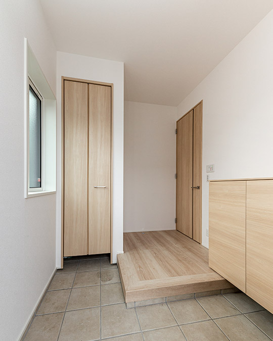 玄関框をL字型にすることで、スペースを有効活用できる玄関。土足のまま出し入れができる土間クローゼットは、外で使う掃除用具など、背が高いものや、かさばるものも収納できて便利です。