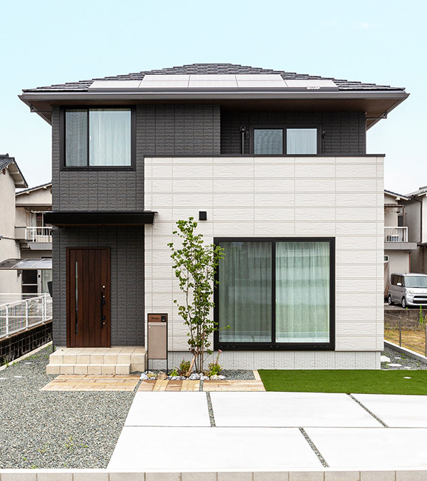 高いコントラストの外壁を張り分けることで、立體感を強調する外観。ステージバルコニーによって2階の掃き出し窓が奧まって位置し、深い陰影を生み出すとともに、外部から室內が見えにくくなるのでプライバシーに配慮する効果も期待できます。