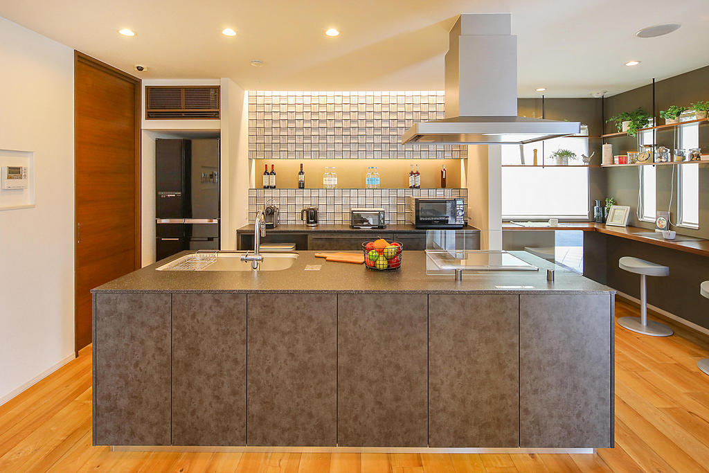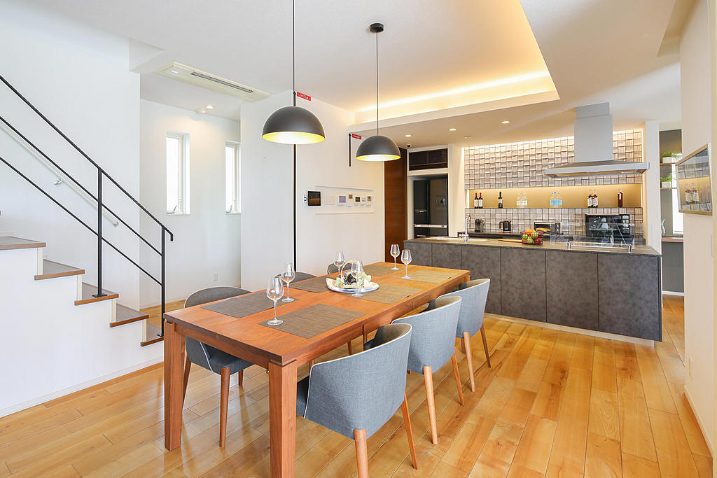 寄棟のシルエットが美しい外観と、シンプルで素材感のある溫かい生活を楽しむ家族の住まい。ナチュラルな色合いの天然素材を多く取り入れ”うちカフェ”のイメージで落ち著いた空間をご覧いただけます。