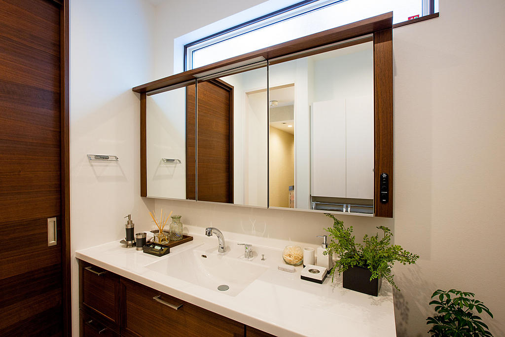 上部の窓から光が差し込み明るい洗面室。朝の忙しく混雑しがちな洗面室も家族皆が使いやすい空間です。