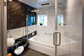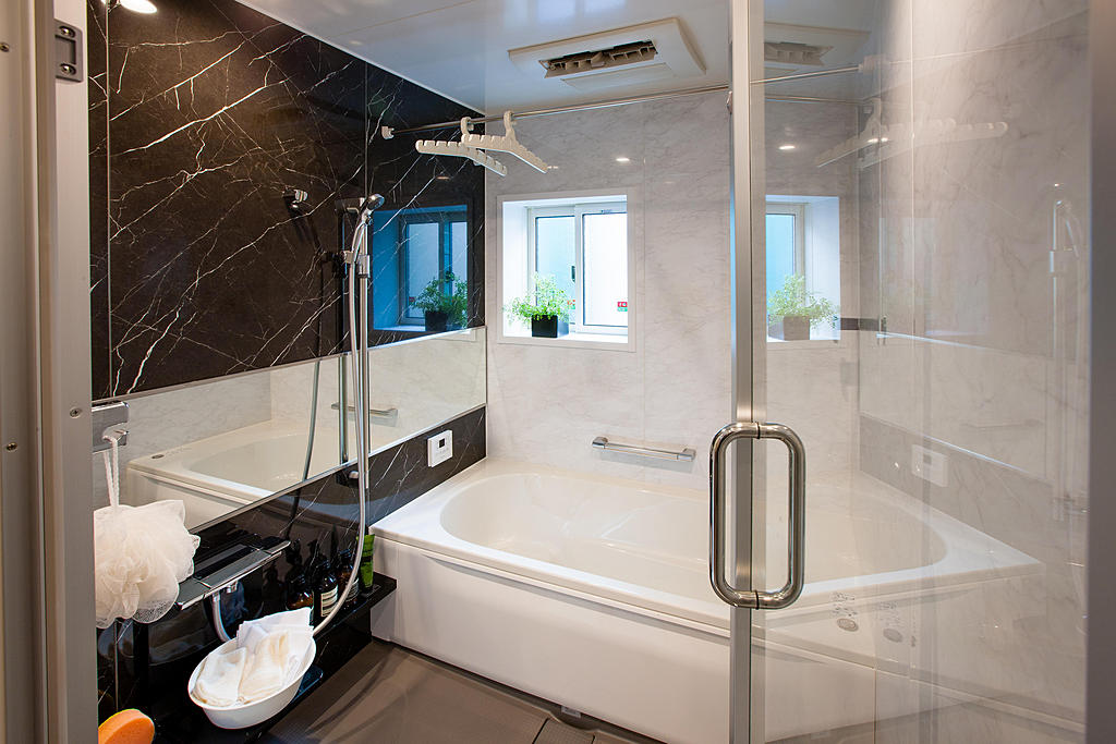 ワイドミラーのついた浴室は、一般的なサイズでも広々としてすっきり。