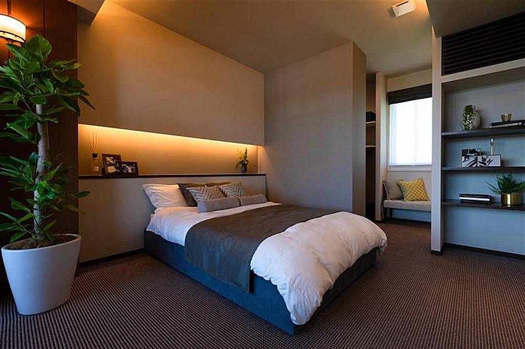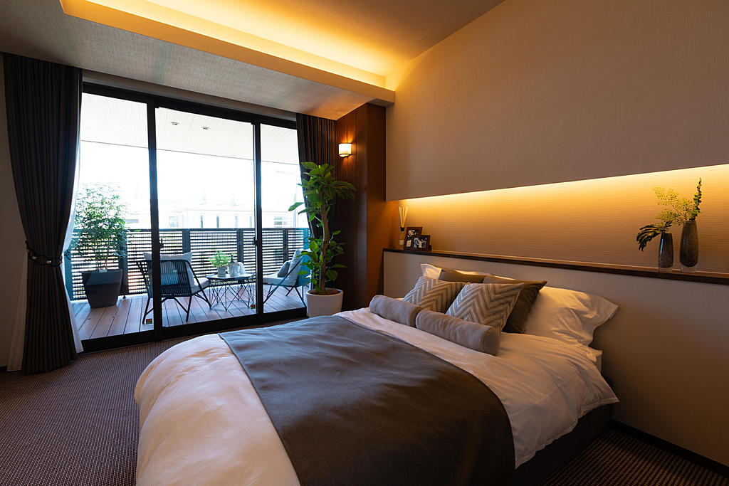 壁に埋め込まれた間接照明が心地よい主寢室。