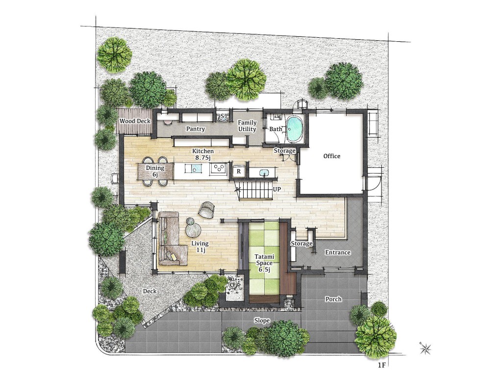 xevoΣの特徴である2,720mmの天井高が広がりを感じる空間を演出。回廊型のキッチン、ダイニング、ユーティリティスペースや読書を楽しむスペース。書斎コーナーやドレッシングルームなど暮らしのアクセントとなるアイデアをプランニングいたしました。