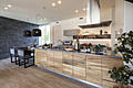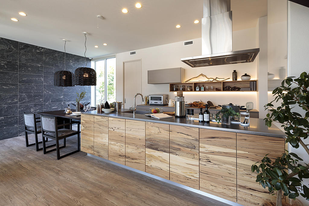 「トリュフビーチ」と呼ばれる色合いや木目が美しい突板を取り入れたキッチン。