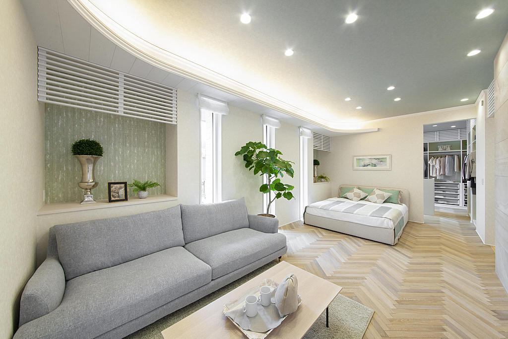 天井高2m72cmのグランリビング。適材適所の間接照明が高級感を演出します。