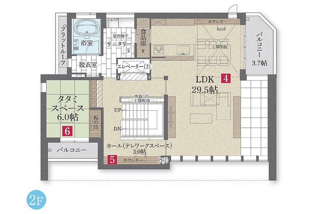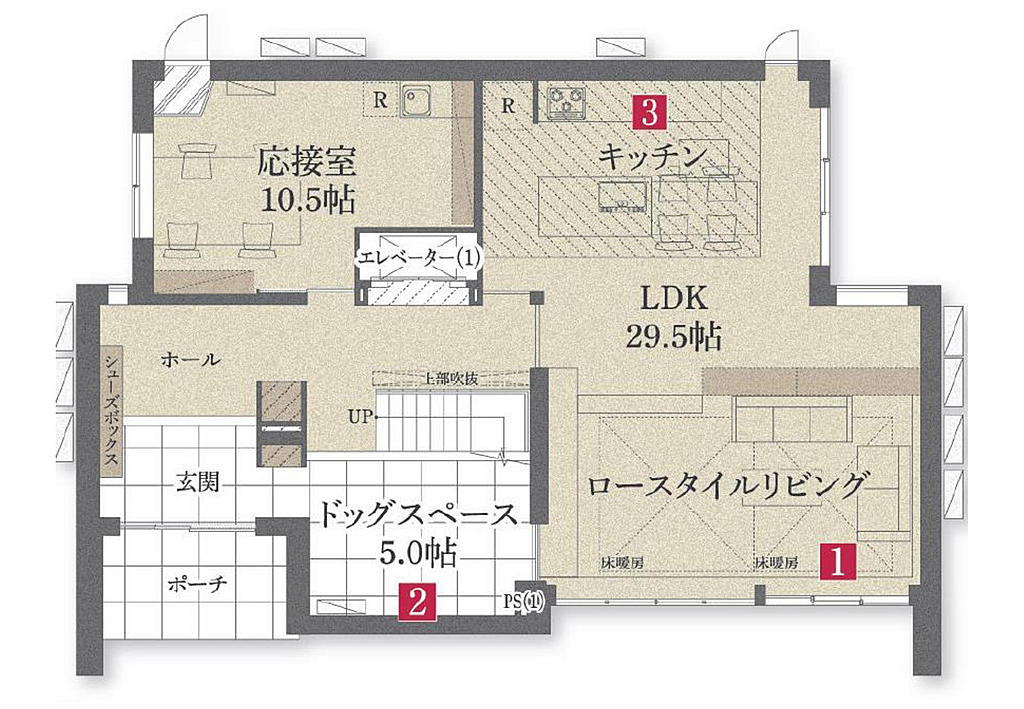 | 見どころ | 明るいリビング|リビング大開口|子育て提案|ペット提案|収納提案|家事動線に工夫がある|靜音室(やすらぐ家)|多世帯住宅|吹き抜け|外構(庭)に工夫がある |