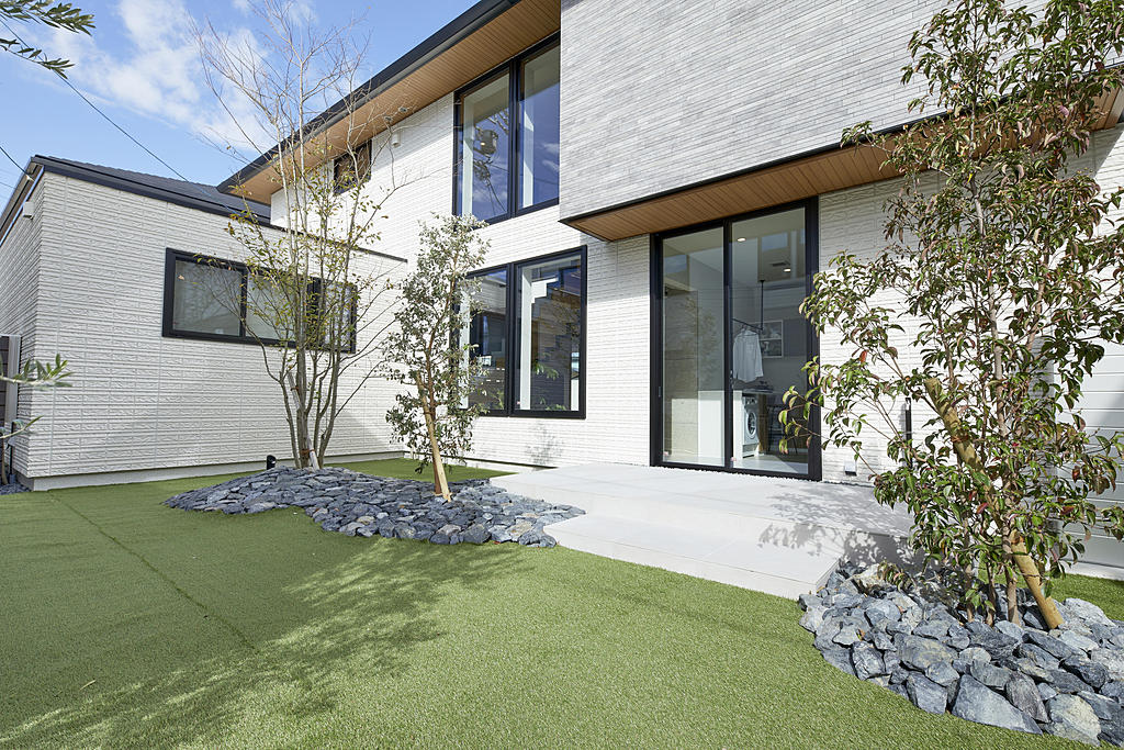| 見どころ | 明るいリビング|リビング大開口|子育て提案|収納提案|家事動線に工夫がある|靜音室(やすらぐ家)|ランドリールーム|吹き抜け|外構(庭)に工夫がある|外観タイル貼り|広いバルコニー?デッキ |