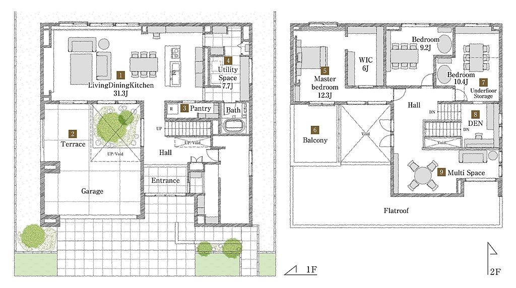 ガレージをブラインドとすることでプライバシー性を高めたプライベートテラスも愉しめる空間です。