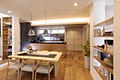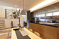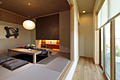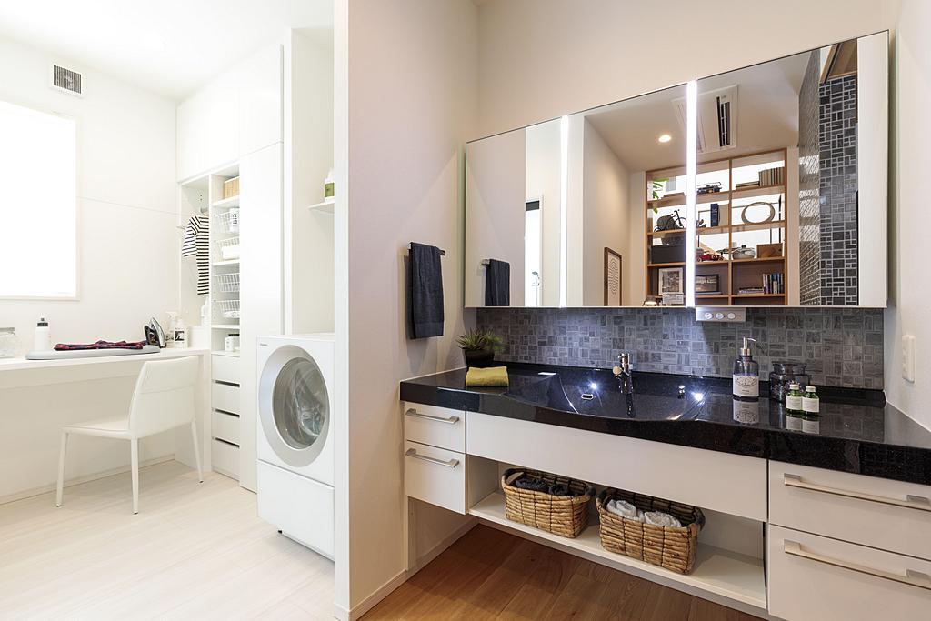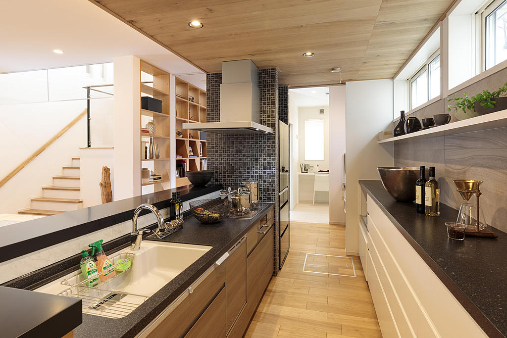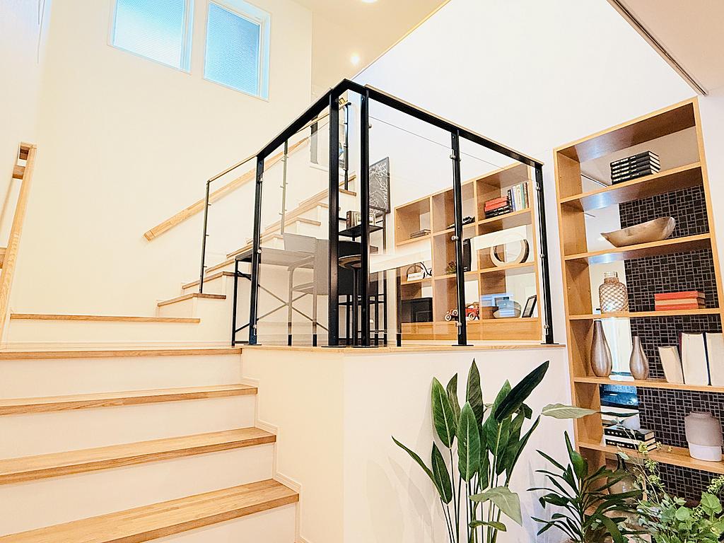 家族が毎日コミュニケーションを取りながら生活できる空間になっております。適材適所に収納を設け、実際の生活スタイルがイメージできます。動線の中のアイストップには、タイルなど表情を変えた空間が家族を楽しませます。また、天井高2,720mmやロースタイルリビング?折り上げ天井による3,160mm天井高にボルダリングと見どころ満載の展示場になっております。