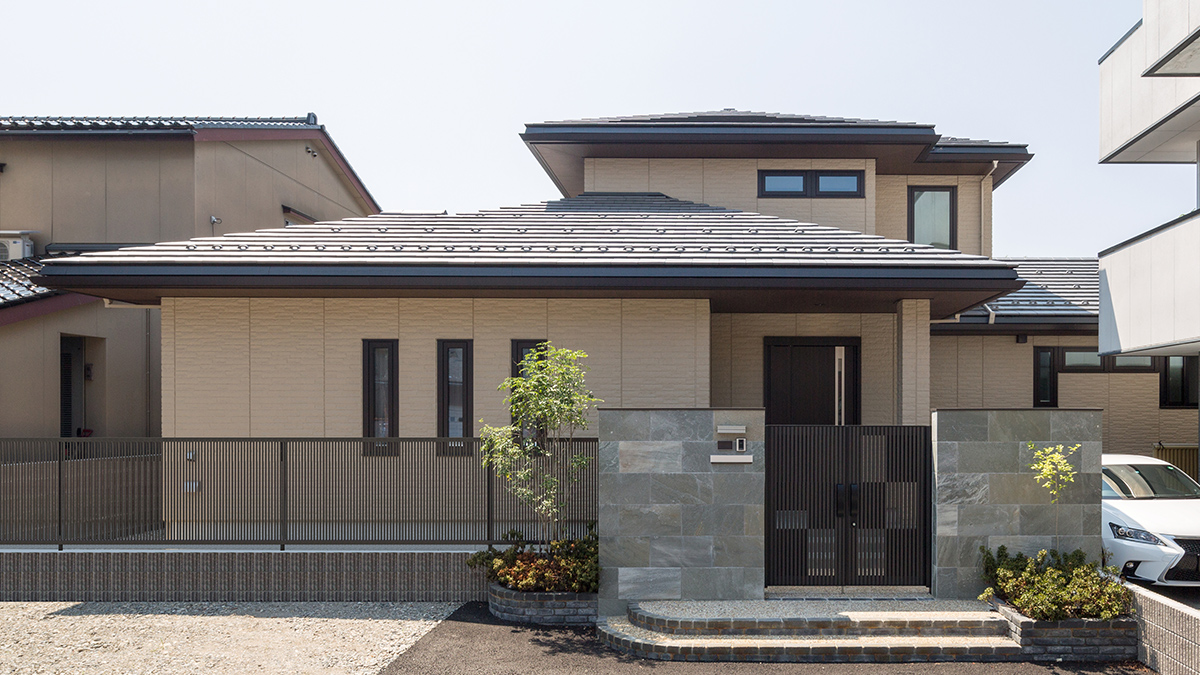 伝統(tǒng)環(huán)境保存區(qū)域で外壁の色づかいや屋根の葺き方にも制約があるなか、和をモダンに取り入れたデザインで地域に溶け込む外観としました。また、広い旗竿形狀の敷地を十分に活用し、2階をコンパクトにした平屋風(fēng)の設(shè)計(jì)で邸宅の存在感を出しています。廊下を無(wú)駄な空間にせず、LDKと洗面?浴室などのプライベートゾーンを分ける空間として生かしたのもポイントです。自分自身、楽しんで設(shè)計(jì)させていただきました。