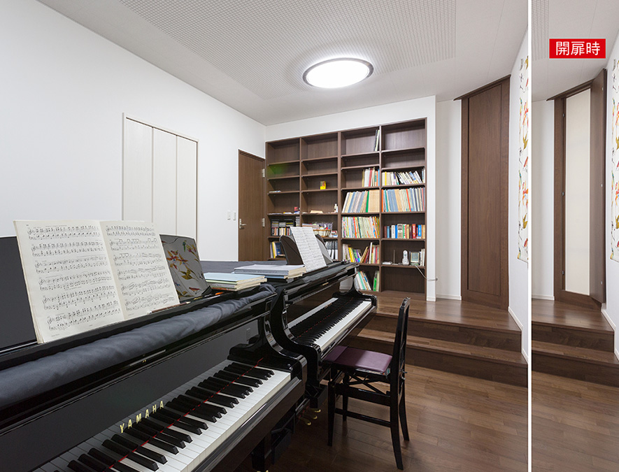 2臺(tái)のグランドピアノが置ける快適防音室&靜音室「音の自由區(qū)」は、ピアノ教師の夫人の夢(mèng)を葉えたもの。床を下げたハイグレード防音で、音漏れも外部からの音の侵入も防ぎ、右角にあるコーナーチューンの開閉で音の響きを調(diào)節(jié)できます