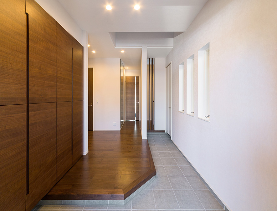 シューズクローゼットをすっきりと収めた玄関ホール。ピアノの生徒たちも訪れるため、靴がたくさん並べられるよう、タイル土間を長(zhǎng)くしてL字に配置。