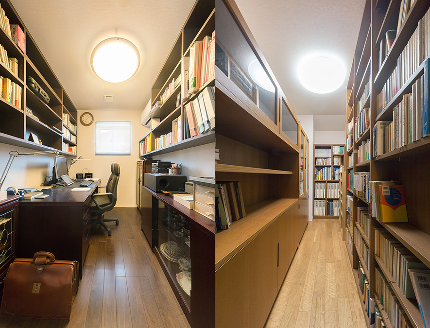Kさま愛用のデスクや家具を美しく収めた書斎スペース。吊り本棚も造り付けに。廊下を挾んだ対面に書庫(kù)も設(shè)けて膨大な蔵書をすっきりと収納しています