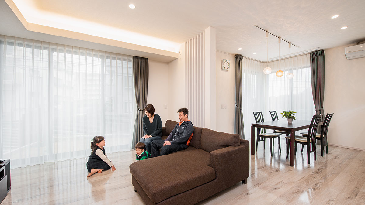 白の木目フローリングが美しいLDK。2m72cmの天井高を生かし、天井面を間接照明で彩りました。和室の橫の壁に本棚と二人のお子さまが並んで座れるカウンターデスクを造作し、勉強スペースに。リビングとダイニングは白い格子壁で視線を通しながら、さりげなく間仕切りしています。