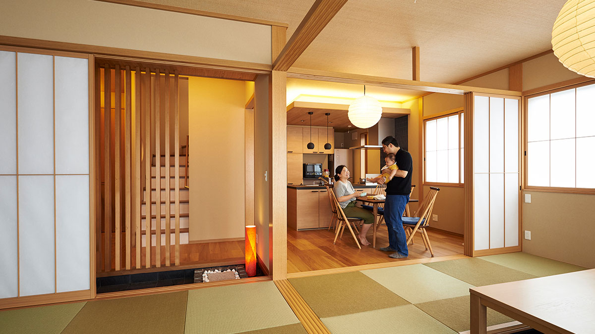 「外國人のお客様に日本の文化を感じてもらえる住まいにしたい」というCさまの思いに応え、障子の間仕切りをご提案。畳のリビングは和室ともダイニングともつながり、シーンに合わせた使い方が可能です。玄関ホールは木格子、化粧天井の間接照明、枯山水風の踏み石で風雅な旅館のように演出。プライベートとパブリック空間を分ける動線にこだわり、お客様が玄関土間から直接客間に出入りできるようにしました。