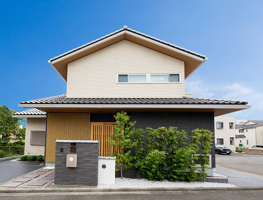 1階に重心を置き、下屋の瓦屋根を美しく見せた切妻屋根のバランスの良い外観。立體感のある割石調の外壁に、深い軒が趣豊かな陰影を創り出しています。瓦を載せた門塀でいっそう和の風情を感じる佇まいに。