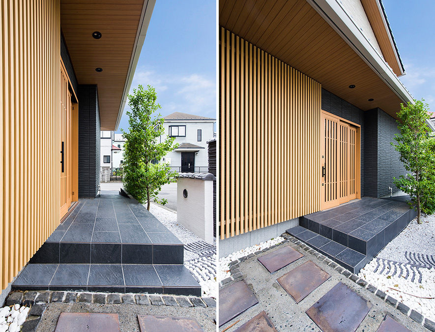 彫りの深い墨色の外壁が、木調の玄関引戸や格子壁、深い軒天と美しいコントラストを見せる玄関ポーチ。鉄錆色の踏み石や白玉砂利に瓦を埋めたアプローチの演出も和の佇まいにしっくりと調和しています。
