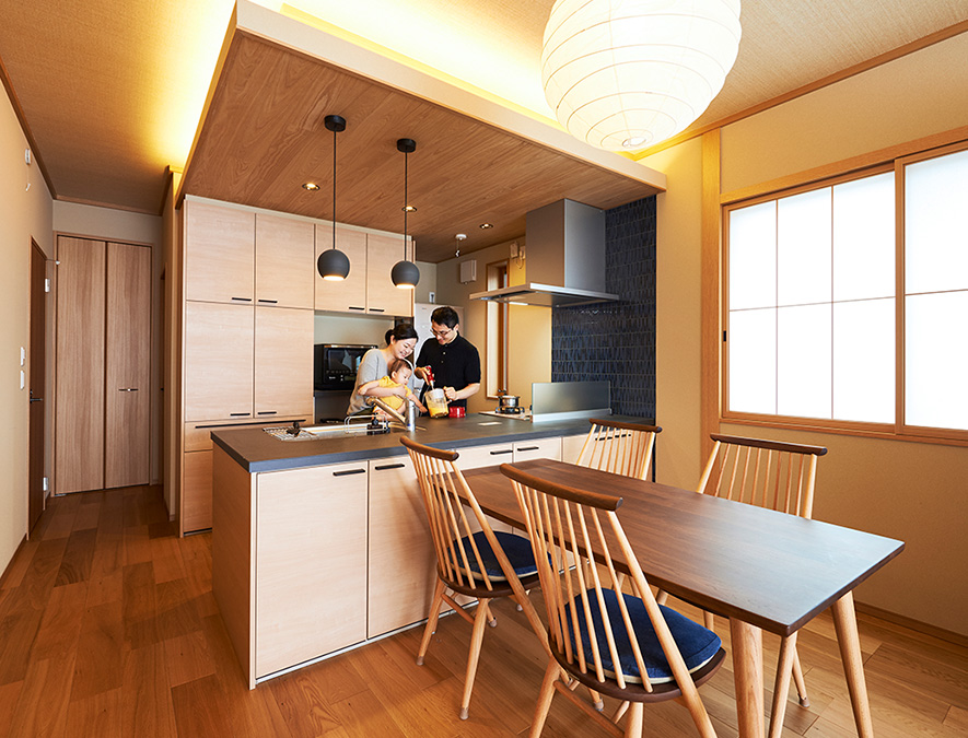 キッチン上に設けた板張り天井からやわらかな光が美しく拡散するダイニングキッチン。ガスコンロの橫壁には藍色のタイルを貼り、インテリアのアクセントに。和モダンな空間に和紙張りの照明が調和しています。