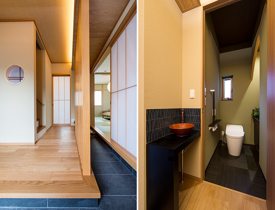 タイル土間で囲み、お客様とご家族の動線を分けた玄関ホール。お客様は土間から直接、和室の客間に上がれるので、ご家族の暮らしと切り離せます。トイレも玄関に配置し、外に手洗い臺を。朱色の陶器ボウルが印象的です。