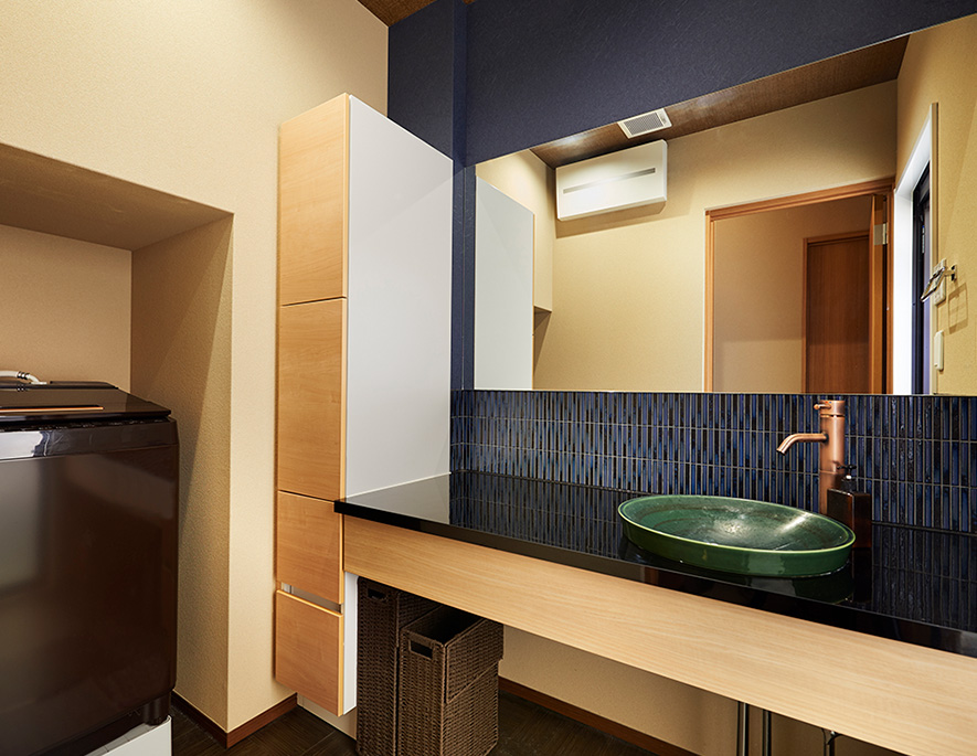 キッチンから続く家事動線の良い洗面室。洗面化粧臺は黒いカウンターに藍色のタイル壁をあしらい、深緑色の陶器ボウルと真鍮風の水栓金具で和風旅館のような雰囲気に。