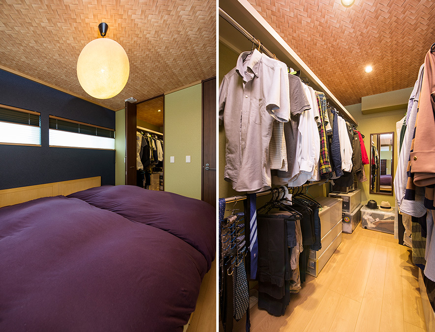 網代柄の天井で和のテイストを取り入れた寢室。紺色の和紙クロス壁に橫長窓を配し、ほどよく光を採り入れています。パープルのベッドカバーがシックな空間の差し色に。収納力たっぷりのウォークインクローゼットも設けました。