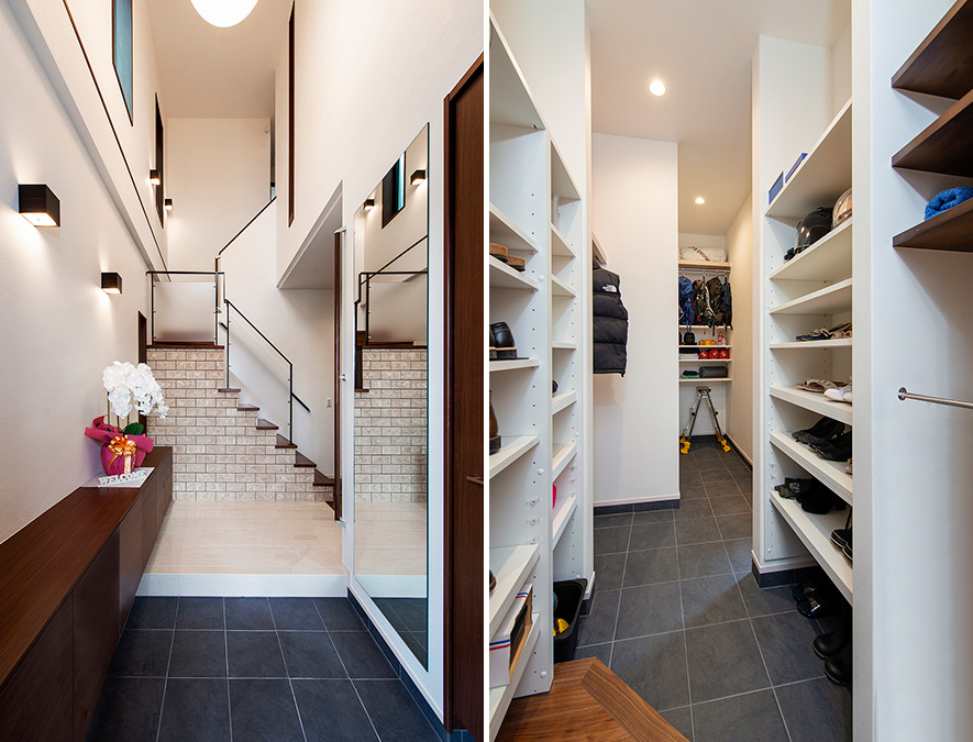 玄関ホールは吹抜けにして階段を配置。床に大理石調のタイルを合わせ、階段の壁には、形狀に沿って丁寧にタイルを張ってエレガントな空間に。「イメージ通りでとても気に入っています」とIさま。玄関収納にはご夫妻の趣味である登山の道具類をスッキリとしまわれています。