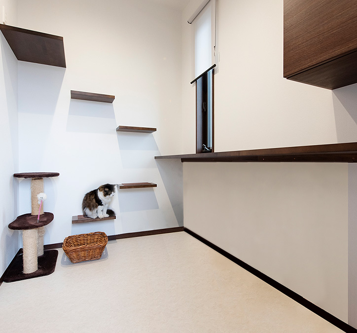 愛貓が家族の近くで過ごせるように、リビングの隣にペットスペースを設けました。キャットウォークや棚などを造作して、飽きのこない空間になるようにまとめています。「バルコニーに面しているので、風通しもいいです」。