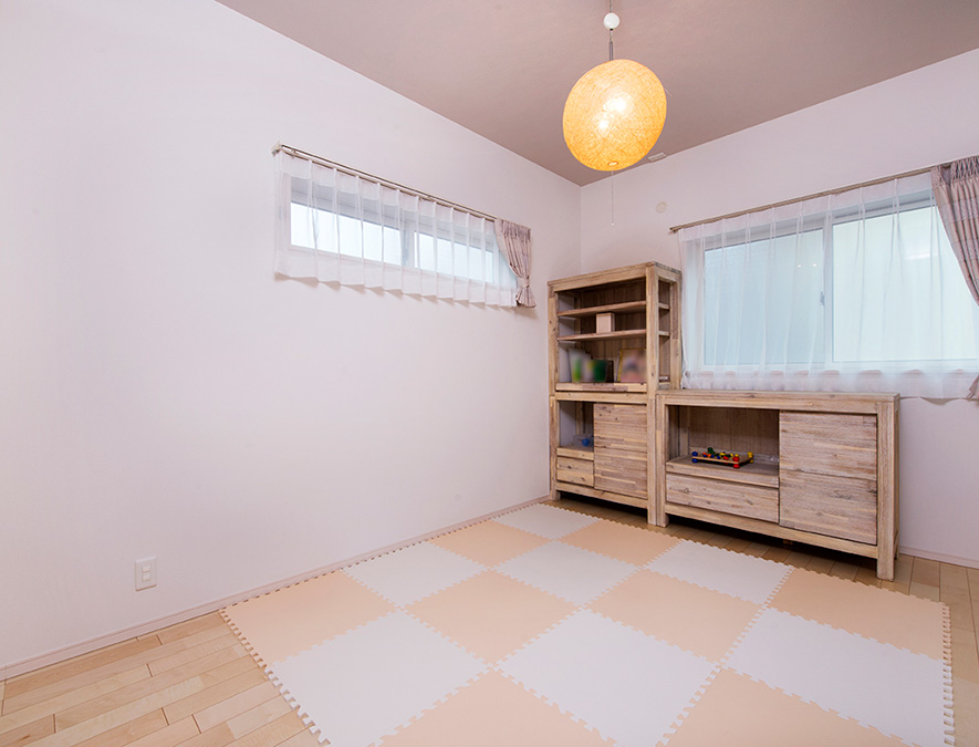 娘さまの部屋は、クロスやカーテンともに優しい色合いでまとめ上げ、お手持ちの家具がよく映えています。「今は娘の遊び場所として使っています」とIさま。