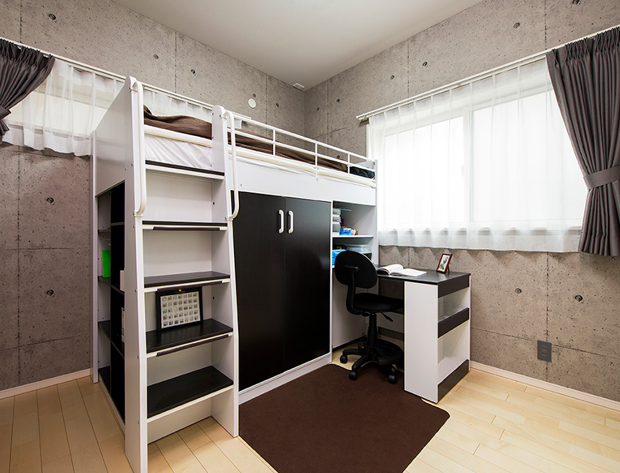 息子さまの部屋は、遊び心のあるクロスを採用。「この部屋のクロスは自分で選んでもらいました。新しい住まいも自分の部屋もとても気に入っています」とIさま。天井高を活かして、ロフトベッドもゆったりと配置できる空間となっています。
