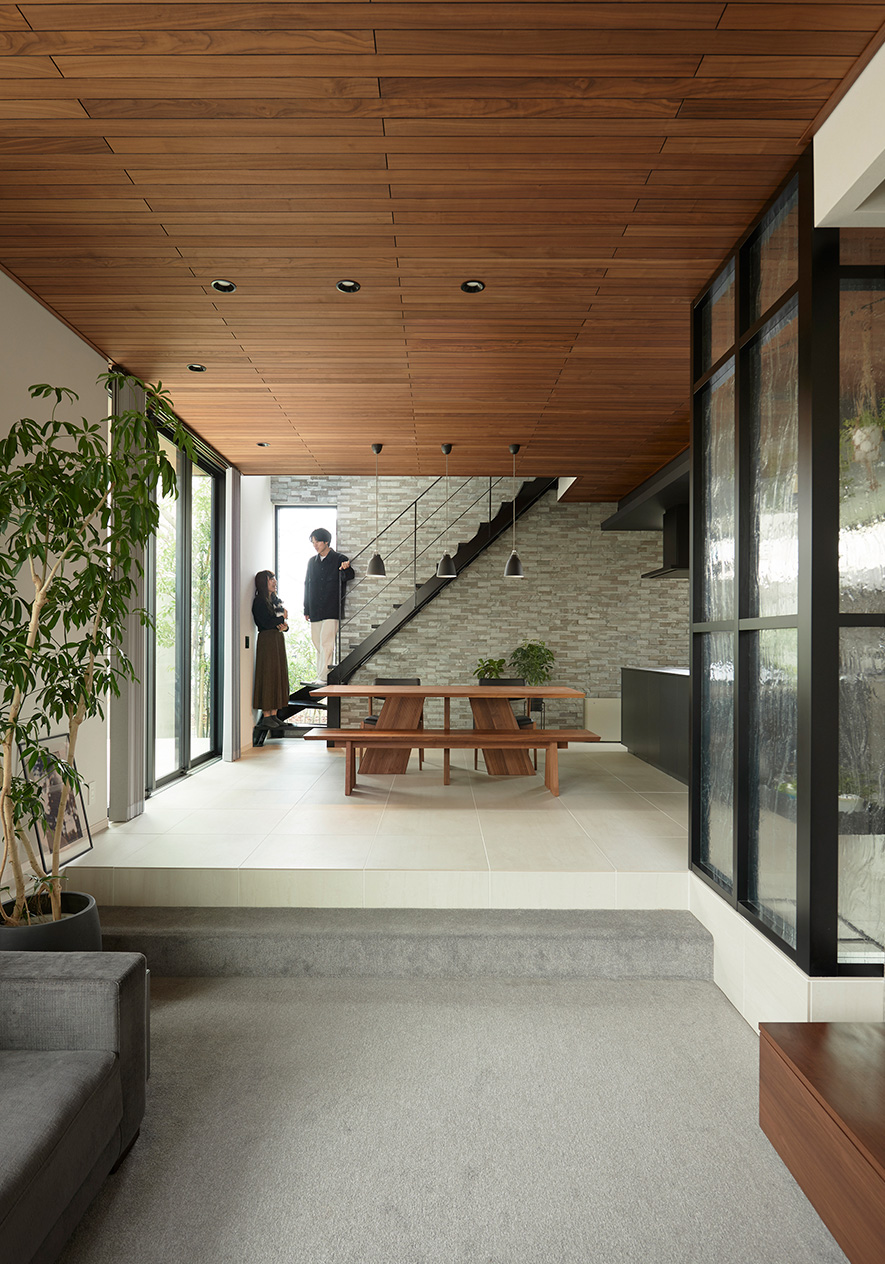 敷地に面した遊歩道と桜の眺望を生かすプランをご提案し、お喜びいただけました。デザインのポイントは「連続性」で、タイル貼りの床とテラスのつながり、板張り天井と軒天のつながり、グランフルサッシの連なりなど連続する美しさを大切にしています。また、「ライフミーティング」で以前のご自宅を拝見した際、お灑落な小物をお持ちだと知ったことで、キッチンに飾り棚をつくるなど、Kさまのセンスを活かす設計提案を心がけました。