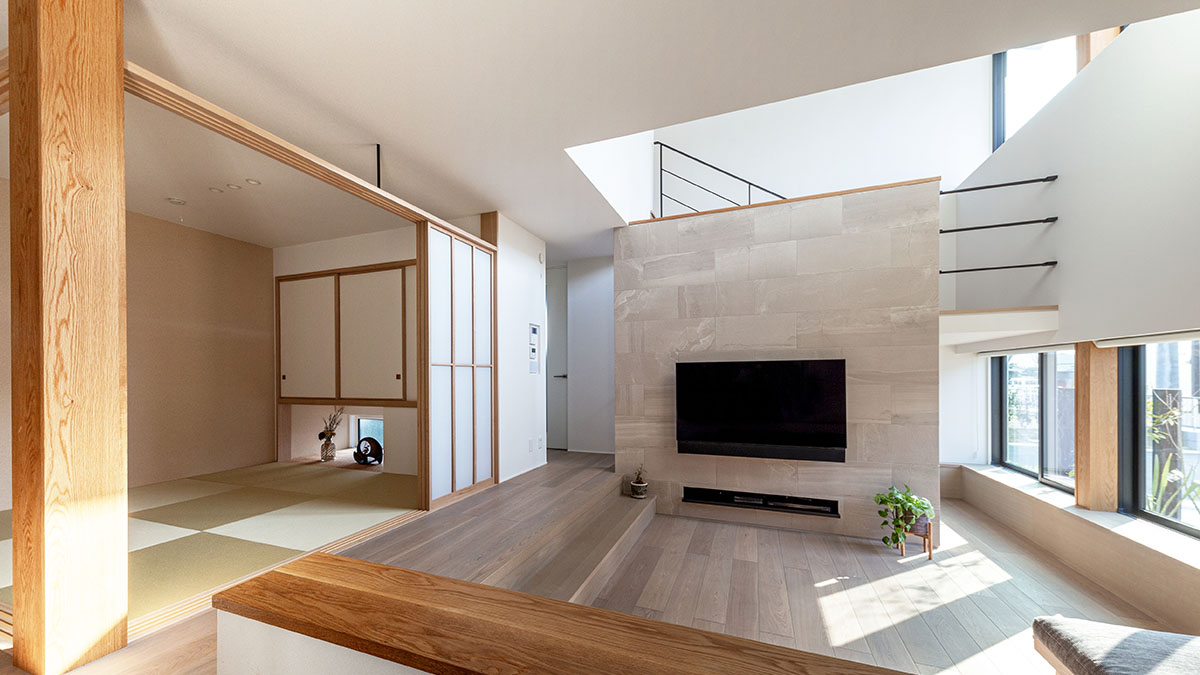 切妻屋根の和モダンな佇まいに木調格子が調和するTさまのお住まい。ロースタイルリビングと階段をつなげて吹き抜けにしたナチュラルモダンなLDKに、吊り鴨居の和室が違和感なく溶け込んでいます。「友人を招いたときもキッチンに集ったり、リビングの段差に腰掛けたり、思い思いの場所で気軽にくつろいでもらえるのがいいですね」とTさまの笑顔がはじけました。