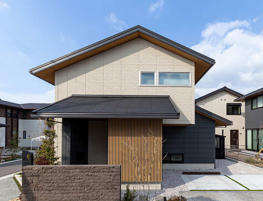 角地に映える切妻屋根の和モダンな外観。外壁をベージュと黒の2色で張り分けて、落ち著いた中にもメリハリのある表情に。玄関ポーチは木調格子をアクセントに用い、深い軒の出で趣ある佇まいに演出しています。