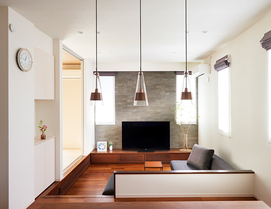 大きな屋根の深い軒の出や味わいある黒の外壁が風(fēng)格を漂わせるIさまのお住まい。ご家族が集まるLDKは和室とつながるリビングをロースタイルにして、オープンながら高低差でメリハリのある表情豊かな空間に仕上げています。「畳でくつろいだり、ソファに座って映畫(huà)を見(jiàn)たり、どこにいても居心地がいいから、それぞれが好きな場(chǎng)所で思い思いに過(guò)ごしています」と笑顔で語(yǔ)るIさまです。