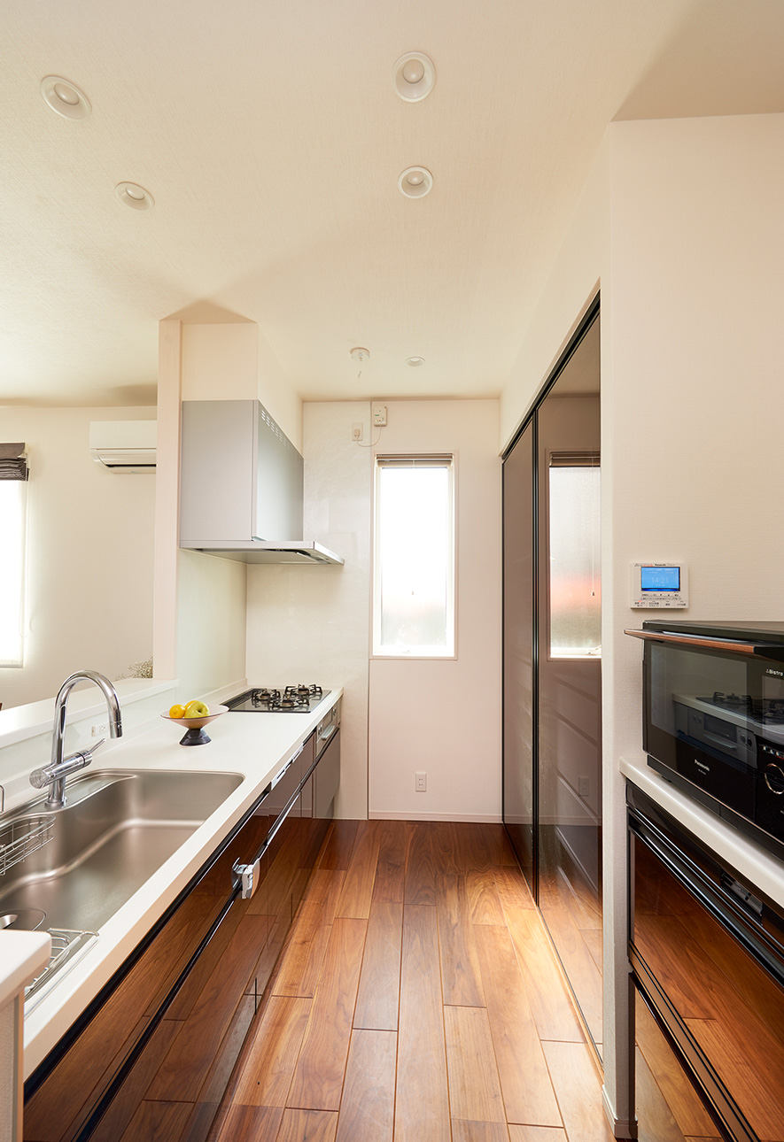 玄関ドアを開(kāi)けたときに明るい印象になるよう、白い大理石調(diào)フロアを用いて洗練された空間に仕上げました。また、LDKはIさまのお好きなウォールナットを使いながらも、重くなりすぎないように壁面は白ですっきりとコーディネートしました。ご夫妻はお好みのイメージを明確に伝えてくださり、お打ち合わせでも活発なディスカッションができたので、Iさまの熱意を感じ、ご満足いただける良い家をつくろうという気持ちがわき上がりました。