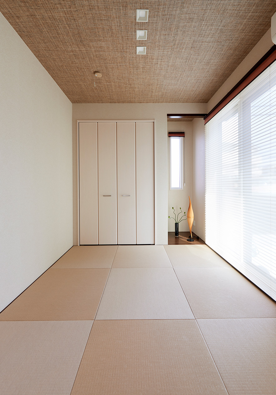 ロースタイルリビングに面した和室は、縁無(wú)し畳やプリーツスクリーンで和モダンな雰囲気に。織布のようなテクスチャーの天井が落ち著きを生んでいます。「畳でゴロリとなったり、ソファでくつろいだり、思い思いの場(chǎng)所で過(guò)ごせるから居心地がよくて」とIさま。扉を閉めると個(gè)室の客間としても使えます。