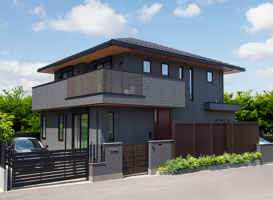 大きな屋根に守られた奧行き感のある外観が、ひときわの存在感を放つIさま邸。彫りの深い黒の外壁にバルコニーのコーナーに用いたルーバー壁が調(diào)和し、軒天の明るい木目調(diào)がアクセントに。柱なく張り出した深い軒の出やキャンチバルコニーの美しいシルエットが際立ちます。