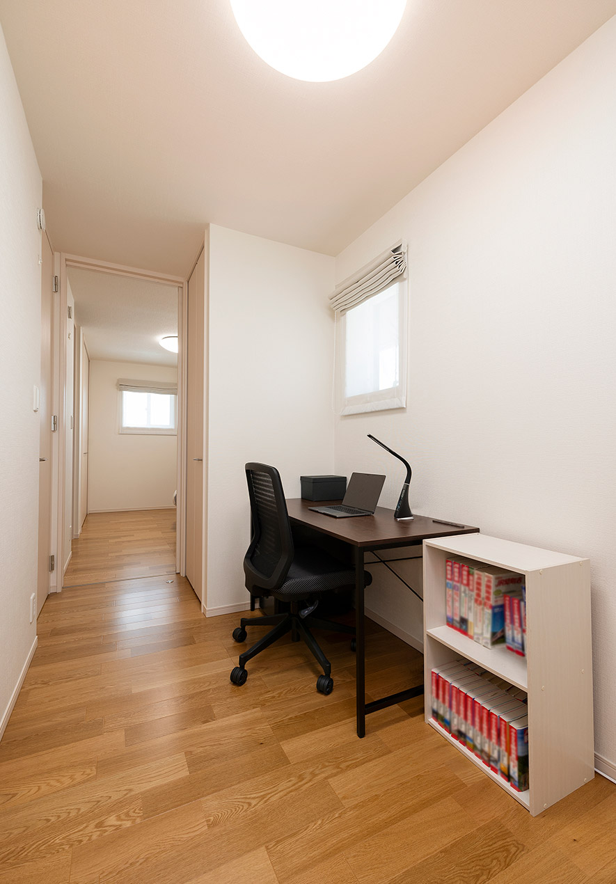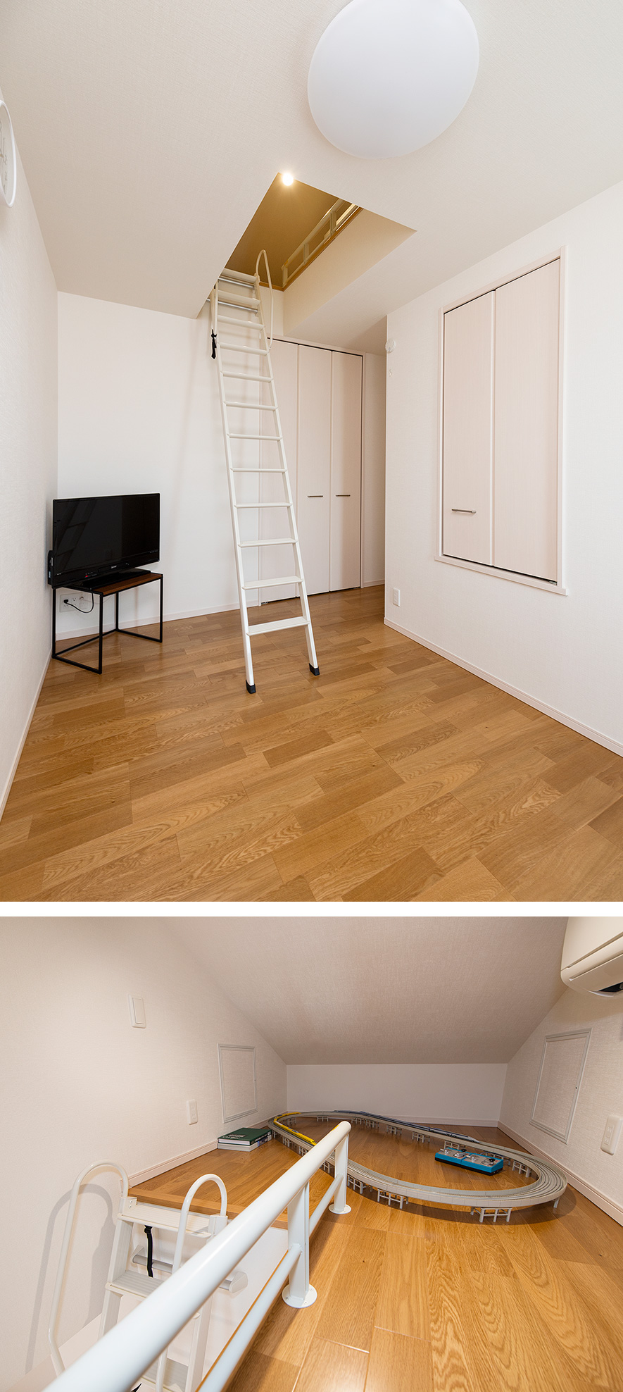 白を基調(diào)にしたシンプルな娘さまの部屋。2カ所の収納で、すっきりと片付いた美しい生活をかなえています。ハシゴで上がるロフトはおこもり感があり、隠れ家にいるようで心が落ち著くそう。大きな鉄道模型を広げて楽しむこともできます。