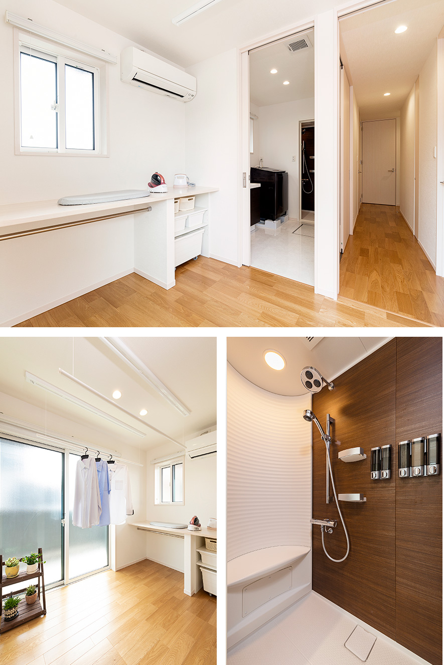2階の洗面室の続きに設(shè)けたユーティリティに、室內(nèi)物干しやアイロン掛けのカウンターを設(shè)置して洗濯家事をスムーズに。回遊動(dòng)線(xiàn)で廊下ともつながっているので、各部屋に乾いた衣類(lèi)を運(yùn)ぶのも便利です。また、洗面室の隣にはシャワーブースもあり、2階でサッとシャワーを浴びることができます。
