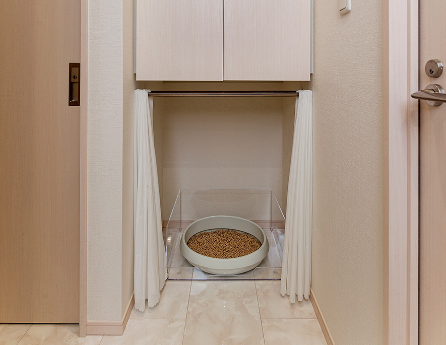 洗面?浴室近くの廊下に設(shè)けた愛(ài)貓のトイレスペース。アクリル板でトイレを囲んで、砂の飛び散りを防止。來(lái)客時(shí)はカーテンを引いて目隠しできます。上部の収納棚に貓砂やフードなどのペット用品を収納できるのも便利です。