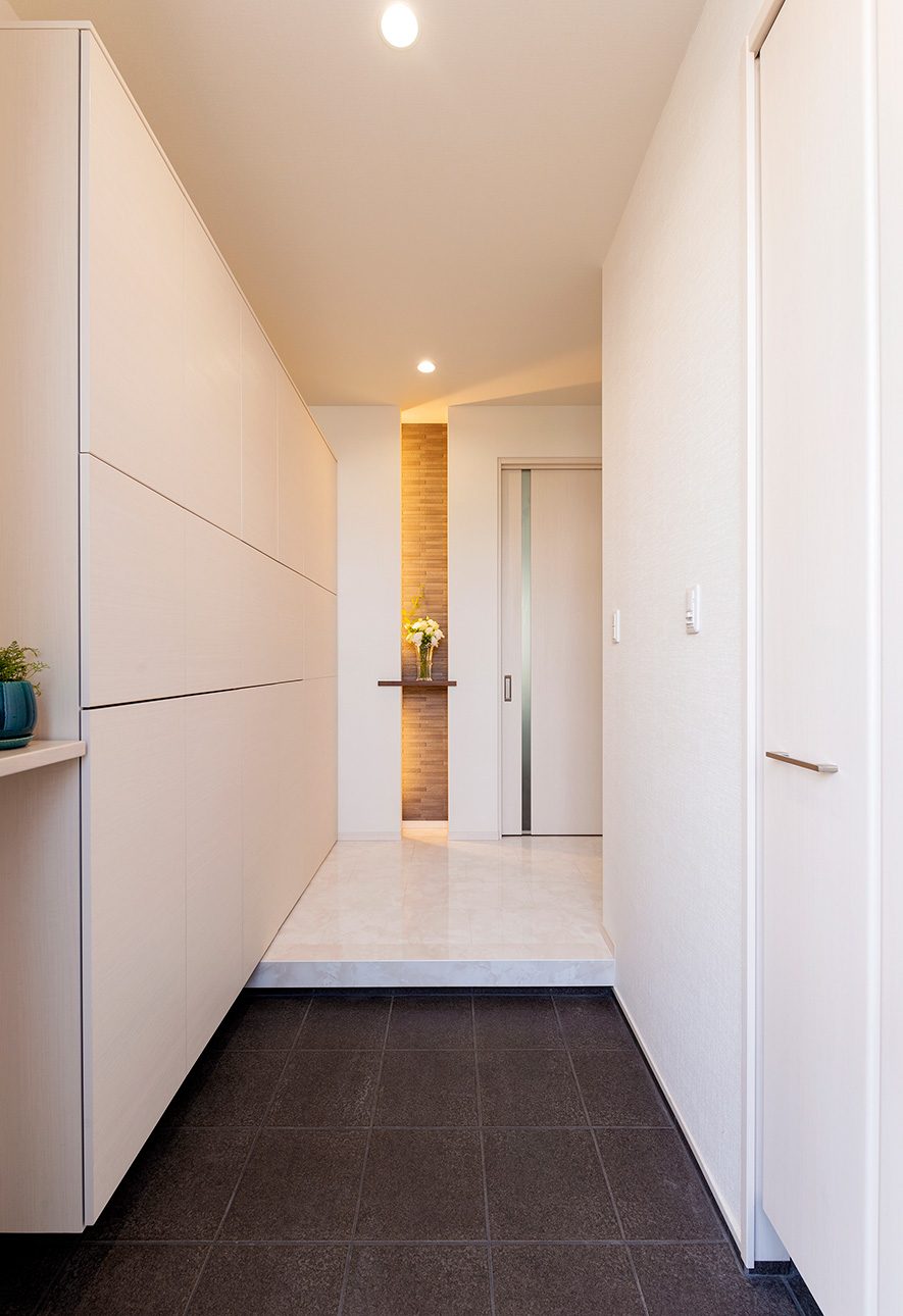 間接照明に照らされたスリムなニッチが「白」の空間に美しく映える玄関ホール