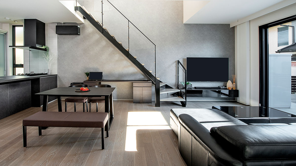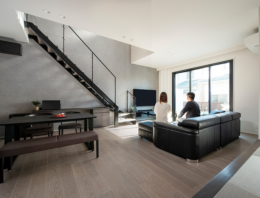 落ち著いた環境でお子さまを伸びやかに育てたいとの思いから、閑靜な住宅街にお住まいを建てられてマンションから移り住まわれたYさま。黒いスチール階段が吹き抜けに映えるLDKはモノトーンのインテリアがスタイリッシュ。「回遊動線なので家事がスムーズにこなせますし、子どもも家じゅうをグルグル走り回って楽しそうです」と笑顔のYさま。日當たりの良い2階ホールでお子さまと遊んだり、芝生の庭でゴルフの練習をしたり、ご家族の幸せ時間を満喫されています。