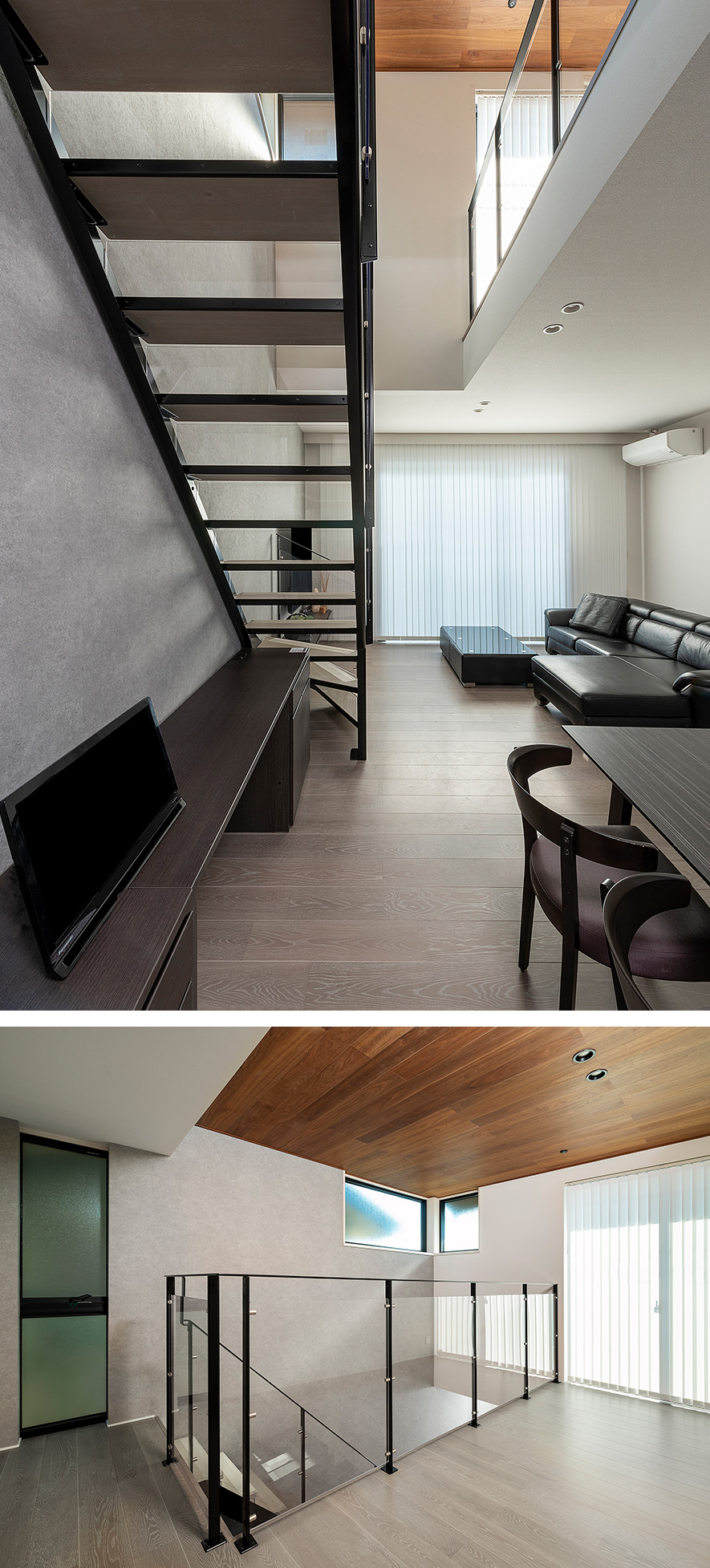 リビングのスチール階段を配した吹抜空間には、大きな壁面のアクセントクロス、木目の天井、間接照明を取り入れて、階段を上る時に眺めても楽しさを感じられるような工夫をしました。戸外の街路樹が見える仕掛けを隨所に施すなど、視線の移り変わりを意識してさまざまな場所に「見せ場」を散りばめることで、歩いていても変化する景色が楽しいお住まいになりました。また、ご家族のライフスタイルに合った動線計畫で、暮らしやすさにも配慮しています。