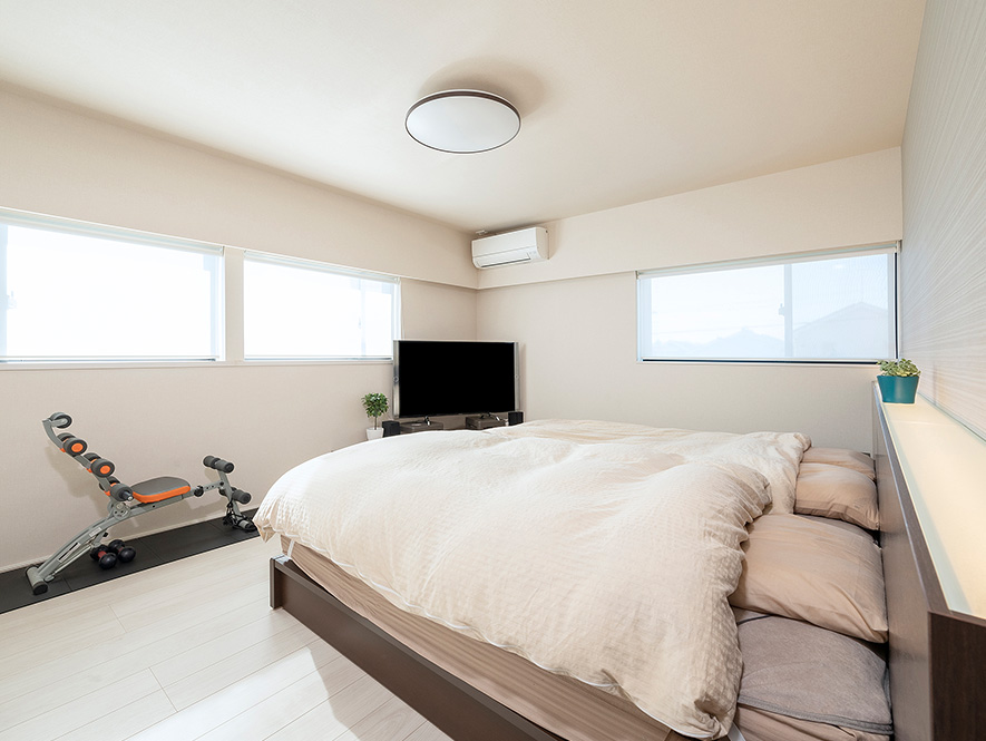 二面の窓から光がふんだんに差し込む寢室は、クイーンサイズのベッドを置いてもゆとりの広さ。「窓際にトレーニングマシンを置いて、ここで筋トレもしています」とYさま。ベッドヘッドにはスリムなカウンターを造り付けに。乳白色の天板から柔らかな光が拡散し、枕元を優美に彩ります。