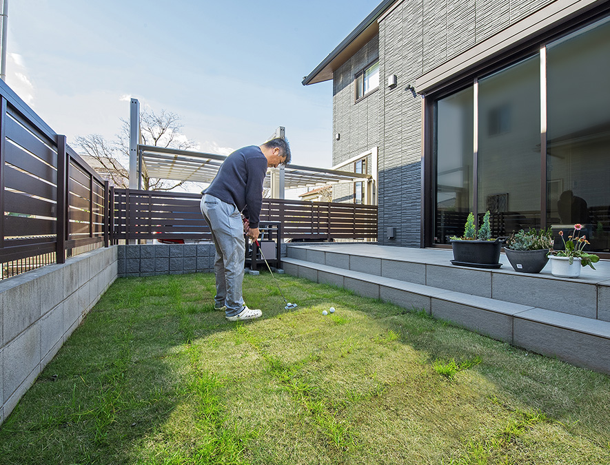 大開口サッシでリビングとフラットにつながるタイル床のテラスは、アウトドアのくつろぎスペース。「気候の良い季節にはテーブルとチェアを出してテラスで朝食を楽しんでいます」とYさま。「共通の趣味はゴルフ」というご夫妻。芝生の庭でパターの練習に勵まれています。