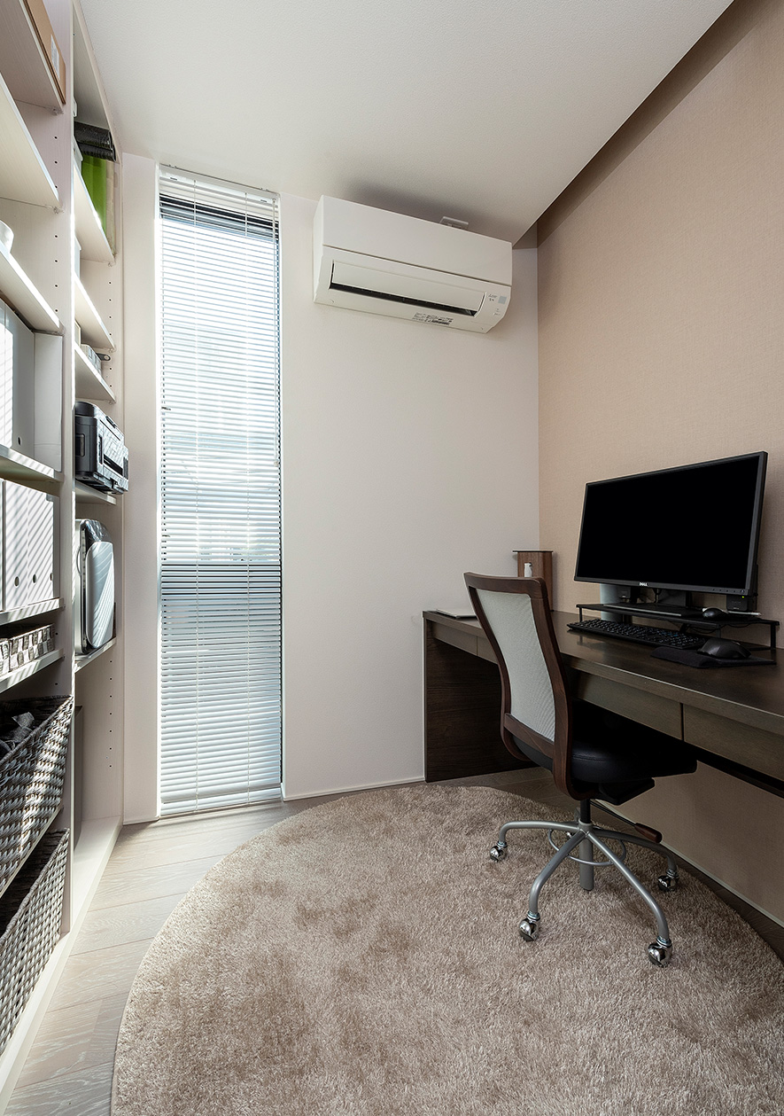 玄関ホールのそばに設けた書斎。黒い木製デスクを造り付け、デスクの上の天井に間接照明を設置して、落ち著いて仕事ができる環境にしました。背面には収納棚を造り、橫壁には天井まで屆く縦長の大きな窓を配置。光とともに外の眺めも取り入れて、作業の合間にリラックスできるようにしています。