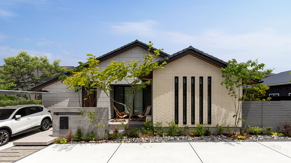 お子さまの誕生を機に、大きな勾配天井を生かした平屋を建てられたKさまご夫妻。「平屋のお住まいで吹き抜けのある大らかな暮らしがしたいという希望が葉いました。友人を我が家に呼んで楽しく過ごすのが大好きなのですが、大勢で集まっても全く狹さを感じません」とのこと。LDKから2つの庭へと視線が抜ける開放感もお気に入りです。「共働きで忙しい毎日ですが、回遊動線で家事もスムーズ。子どもも楽しそうに走り回っています」と笑顔が弾けました。