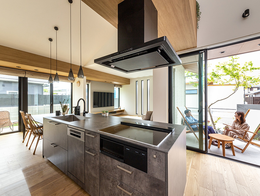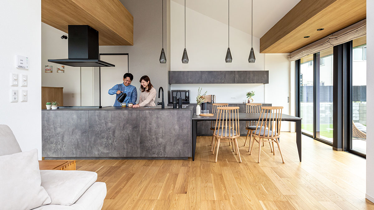 玄関ポーチとつながるテラスや芝生の庭へと視線が広がるダイニングキッチン。勾配天井に渡したナチュラルオーク色の大梁が塊感のあるグレーのキッチンと調和して、すっきりとした中にもメリハリを感じる上質な雰囲気を創り出しています。
