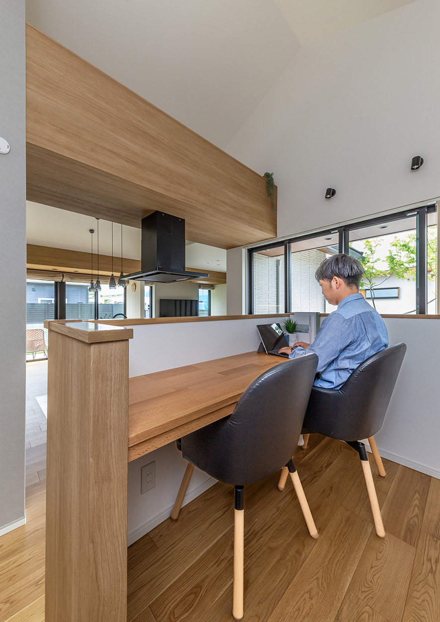 キッチンの橫に設けたテレワークスペース。床の高さを上げ、コの字の壁で囲んで「おこもり感」を出し、LDKにいる家族の存在を感じながらも仕事に集中できる空間に。「天井が高いので気持ちがいいですし、庭の緑も目に入ります」とKさま。