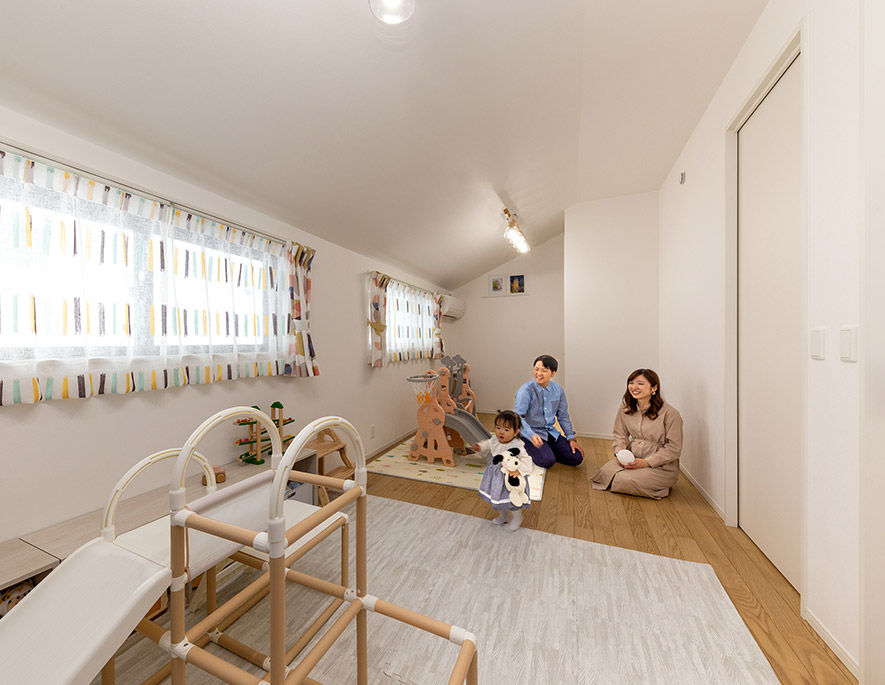 勾配天井を生かした子ども部屋。現在は広々と使い、將來、お子さまが増えたら壁で仕切って2部屋に分けられるよう、あらかじめドアも窓も照明も2つずつ設けられています。