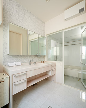 アクセントタイル壁に白い木目扉の洗面化粧臺が調(diào)和する洗面室。「洗面カウンターが広いので、慌ただしい朝も妻と並んで使えて快適です」とIさま。ドアと壁を透明ガラスにした浴室は、おしゃれな洗面室と相まってリゾートホテルのよう。